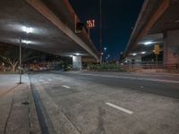 A city at night with clear skies. The urban landscape is illuminated by street lights and artificial lights from buildings. Roads and bridges are lined with guard rails and Armco barriers. The urban design creates a dark and captivating atmosphere.