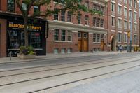 This image captures the vibrant city life in Toronto, Canada. The photo showcases a bustling neighborhood with various buildings and properties. The city streets are lined with asphalt roads, brick walls, and concrete fixtures. The urban design and architecture are highlighted through the facades, windows, and doors of the buildings. The streets are filled with pedestrians, cyclists, and cars, with tires and wheels visible on the road surface. A charming cafe with outdoor seating adds a touch of charm to the scene. This photo represents the lively atmosphere and diverse urban scenery of Toronto.