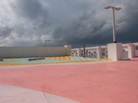 This is an image of a parking lot in Miami Beach, Florida, USA. The grey and gloomy sky hovers over the urban landscape, creating a somber atmosphere. The asphalt surface of the parking lot contrasts against the buildings in the background. This photo represents city life in Miami Beach, with its unique urban design and open spaces. The art district is nearby, contributing to the vibrant culture of the city. This image captures a typical day in Miami Beach, showcasing the urban landscape and the influence of the surrounding environment.