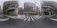 two panoramic mirrors with buildings in the background, on a city street corner