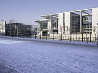 This is an image of a snowy day in an industrial area. The ground and sidewalk are covered in snow, creating a serene atmosphere. The buildings, fences, and benches are coated with a layer of snow, adding to the winter scenery. The tints and shades of the snow create a beautiful contrast against the urban design. This photo captures the beauty of a snowy day in the city, showcasing the facade of the buildings and the tree-lined road. It is a perfect representation of urban winter charm.