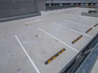 A concrete road surface in an urban city. The open space is lined with parking lots and driveways. Armco barriers and guard rails protect the entryways. A bustling scene of urban design.