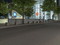 Urban Design in City Thoroughfare with Large Building, Trees, and Road Sign