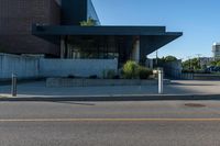 A modern office building in Toronto's business district, surrounded by clear skies and urban design. The concrete facade and composite material provide a sleek profile. The asphalt road and vegetation add to the vibrant cityscape.