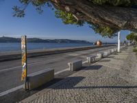 This is a photo taken in Lisbon, Portugal, showcasing the city's urban design and coastal landscape. The clear sky and water create a serene atmosphere, while the buildings and vegetation along the road add to the city life. The photo captures a typical day in Lisbon, with a pier extending into the ocean and a jetty for boats to dock. The asphalt road and pavers provide infrastructure for thoroughfare, connecting the urban areas with the coastline. This photo represents the harmony between the city and the water in Lisbon.