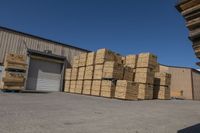 A hardware retail business with a sunny facade and clear skies. A busy lumberyard displays a variety of wood products, including pallets and woodpiles. Construction materials like bricks and concrete are also available.