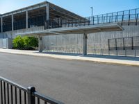 A modern cityscape with clear skies and urban architecture. The road surface and concrete walls are shaded by tall buildings. A bus stop is visible near a bridge. The city comes alive during the day.