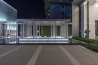 a building with a light at night in front of it, and there is an open area with a courtyard