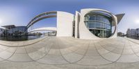 Circular shot of a modern architectural building in Berlin, Germany. The building features a white concrete facade with glass windows and a symmetrical design. It is located by the river, offering a clear sky and a scenic view. A perfect representation of urban design in Europe.