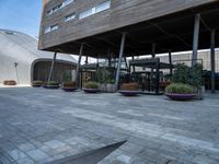 This is an image of a modern cityscape in Holland, Netherlands. The clear sky overhead showcases the sleek and modern architecture of the buildings. The city streets are lined with restaurants, hotels, and urban designs. The asphalt road surface is well-maintained and the paver sidewalks create a stylish and inviting atmosphere. The facade of the buildings reflects the contemporary urban design. This photo captures the vibrant city life and the essence of European urban architecture in Holland, Netherlands.