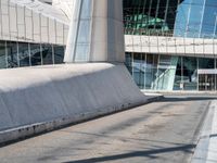 Modern architecture in the heart of Holland. A large concrete wall frames a busy city street, with a man on a skateboard adding a touch of urban energy. A perfect example of urban design in Europe.