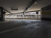 This is an image of a modern parking garage in Berlin, Germany. The architecture of the building features a combination of iron, metal, and glass, creating a reflective surface. The open space of the parking lot provides ample room for vehicles, while the concrete flooring and asphalt road create a sleek urban design. The interior design of the garage includes ample lighting and shadows, creating a visually appealing space. Located in Europe, this parking garage showcases the innovative design and efficient use of space commonly found in German cities.