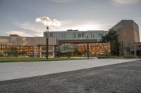a large building that has a glass and stone facade in it's center of a grassy area near many trees