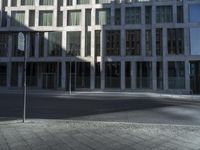 This is an image of a modern office building in Berlin, Germany. The architecture features a combination of glass walls, window reflections, and hard shadows. The city street is lined with trees and the road surface is made of asphalt. The building's facade and profile showcase the urban design of the business district. The image represents the bustling city life and the material properties of the glass and architecture. This photo captures the intersection of modern architecture, urbanization, and European cityscapes.