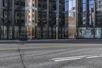 This photo captures the modern architecture of a city street in Toronto, Ontario, Canada. The empty side of the street features a mixed-use building with a glass facade and a glass wall, showcasing urban design and city life. On the other side, there are office buildings and condominiums, representing the metropolitan area. The road surface is made of asphalt and the curbs are lined with tar. The image depicts the vibrant urban atmosphere of Toronto, with its bustling streets and towering buildings. It represents a typical day in the city.