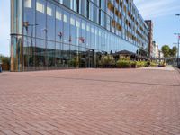 the sidewalk in front of an office building is empty except the sidewalk in front of the building is lined with bricks