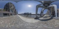 A wide-angle fisheye lens captures the vibrant city life of Hamburg, Germany. Modern architecture and cobblestone roads blend seamlessly with the city's historic charm. Clear skies and a bustling harbor create the perfect backdrop for this urban scene.