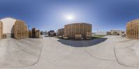 a street with several boxes of logs in the front and behind them a truck, trailer, and barn