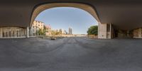 A straight road leads from an empty parking lot into the city, with high-rise buildings and a clear sky in the distance. A brick wall adds texture to the scene. Urban design at its finest.