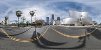 A panoramic view of downtown Los Angeles, California. The curved road leads to high-rise buildings and skyscrapers. Palm trees line the street, adding to the urban design. A bustling cityscape with a perfect blend of architecture and nature.