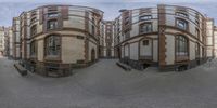 two buildings are seen through the same fisheye lens in this image, there is a bench to go on the sidewalk