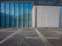 a sidewalk that has several glass doors next to it with buildings in the background behind