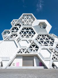 A modern architectural structure in Kaohsuing, Taiwan. The building, made of concrete blocks, features pink doors and windows at the entrance. Its futuristic design adds a touch of uniqueness to the urban landscape.