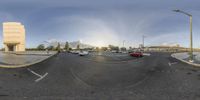 A modern architecture building in Lisbon, Portugal. The city's cobblestone streets and symmetrical facades create a unique urban design. Clear skies reflect in the car's fish-eye view mirror, highlighting the vibrant metropolitan area.