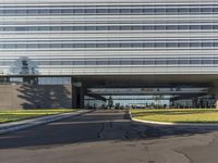 A modern architecture corporate headquarters stands tall in a bustling business district. Clear skies illuminate the low-rise office buildings and urban design. The city life thrives on the asphalt roads lined with race tracks and stadiums.