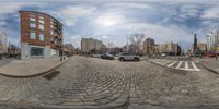this is a fish eye lens showing cars and a building in the city center with some buildings