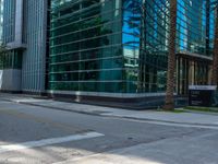 A street view of Miami's bustling business district. Office buildings and urban design dominate the landscape. No curbing at the intersection adds to the city's unique character. Vibrant atmosphere under a clear sky.
