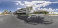 An aerial view of Miami Beach, Florida. A wide-angle shot captures a commercial building with palm trees in the foreground. The empty road below showcases the urban design of the city. The high position allows for a top-down perspective, emphasizing the straight road and the curve of the bridge in the distance.