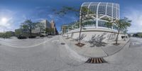 A sunny day in downtown Milwaukee, Wisconsin, with a fisheye lens capturing the vibrant cityscape. Modern architecture and high-rise buildings create a dynamic urban design. Cars and trees line the road, adding to the bustling atmosphere.