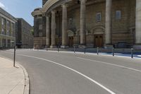 This image captures the essence of city life in Toronto, Canada. The classic architecture and grand facades of the buildings create a picturesque urban landscape. The empty road, lined with columns, leads towards the museum in the background. The public space provides a peaceful atmosphere, with two people casually walking by. This photograph showcases the blend of urban design and metropolitan infrastructure found in Toronto. It is a perfect representation of a typical day in the city.