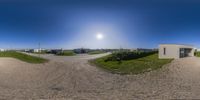 a wide angle panorama of a desert area with many buildings and streets and grass all around the perimeter