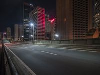 A stunning cityscape at night with skyscrapers and office buildings illuminated by artificial lights. The clear sky accentuates the vibrant city life below. The streets are lined with street lights, while the road surfaces are covered in asphalt. The urban design is complemented by the presence of Armco barriers and guard rails.