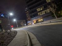 This image captures a night scene in downtown Los Angeles, USA. The city is illuminated by artificial lights, including street lights and traffic lights. The car is seen stopped on the road, with buildings towering in the background. The urban design of the city is evident in the architecture and layout. The dark sky adds to the atmosphere of the scene. This photo represents the bustling city life of Los Angeles at night.
