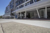 A modern office building with a sleek facade and large windows, located in a bustling city. The urban design integrates seamlessly with the surrounding buildings and the road surface made of asphalt.