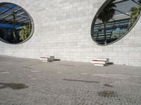 two white benches sit at the base of a large building on concrete and two circular windows sit at each end