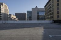 A view of a modern architecture building in downtown Los Angeles. The building stands tall in the clear sky, surrounded by a concrete surface and a parking deck. A symbol of urban design in the bustling metropolitan area.