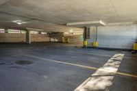 there is an empty parking garage with yellow caution tapes on the pavement and red signs