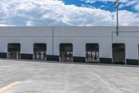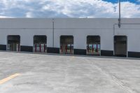 This image showcases a modern urban cityscape in Toronto, Canada. The concrete surfaces of a parking garage can be seen, with a white building in the center featuring multiple doors with windows in the middle and red doors on either side. The city landscape reflects a typical day in Toronto, with clouds overhead. The urban design of the parking garage adds to the city's ambiance. This photo captures the essence of city life in Toronto.