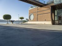 This image captures the vibrant city life in Lisbon, Portugal. The sunny day showcases clear skies and a calm ocean at the coastal harbor. The modern architecture of buildings contrasts with the concrete road surface and the hard shadows cast by the trees and urban design elements. People can be seen enjoying cafes and restaurants along the pier. The skateboarding enthusiast adds a sense of energy and movement to the scene. This photo represents the perfect day to explore the urban open spaces and enjoy the coastal charm of Lisbon.