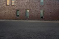 This is an image of a city street at dawn in Toronto, Ontario, Canada. The urban landscape features a mix of buildings with rectangular windows and brickwork. The asphalt road surface is lined with curbs and fixtures. The grey and brown tones of the urban design create a distinctive atmosphere. This photo captures the break of day over the art district of Toronto, showcasing the unique architecture and surface textures of the city.