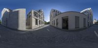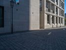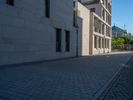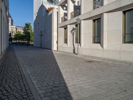 A modern residential area in Berlin, Germany, showcasing urban design and architecture. Clear sky casts hard shadows over city alleys. Daytime in Europe illuminates straight roads with modern buildings.