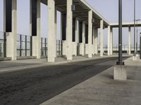 an empty sidewalk that has some columns in it under a blue sky with clouds on the top