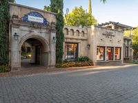 Historic architecture in the heart of Sedona, Arizona. The entrance to a building with a blue tile roof and arched archway creates a striking urban design. Clear skies and hard shadows enhance the city's charm.