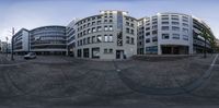 A bustling urban scene in Stuttgart, Germany. Straight down the road, cafes, shops, and restaurants line the streets. The clear sky provides a beautiful backdrop to the city's urban design. Buses parked near the building add to the lively atmosphere.