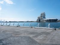 This is an image of a coastal city in Taiwan. The photo captures the urban design and infrastructure of Kaohsuing. In the foreground, there is a pier and a jetty extending into the ocean. The water is calm and the surface is reflected in the wood floor of the jetty. In the distance, there is a sea lion statue and clouds above. This scenic view represents the coastal beauty and urban charm of Taiwan.