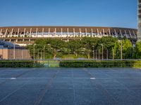 This stock photo showcases urban design in Tokyo, Japan. The city's bustling atmosphere is captured with its vibrant city life, including a stadium. The image depicts a cloudy day with a dirt and gravel surface, providing an authentic representation of Tokyo's urban landscape. The urban design and sport facilities in this metropolitan city offer a unique experience for both locals and tourists alike.
